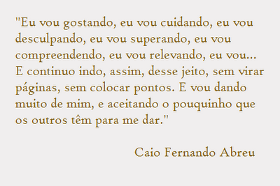 Eu vou gostando, eu vou cuidando, eu vou desculpando, eu vou superando, eu vou compreendendo, eu vou relevando, eu vou...